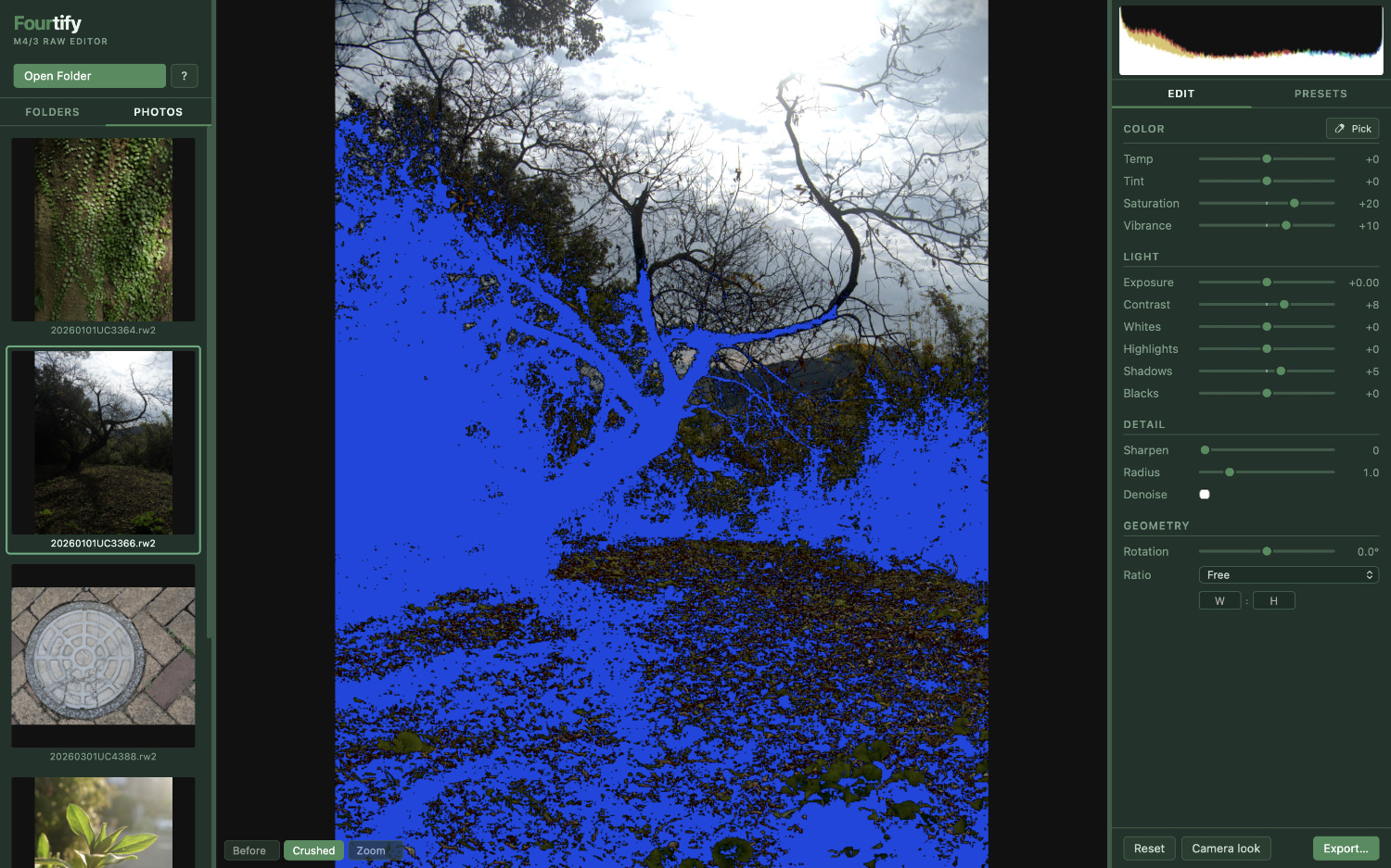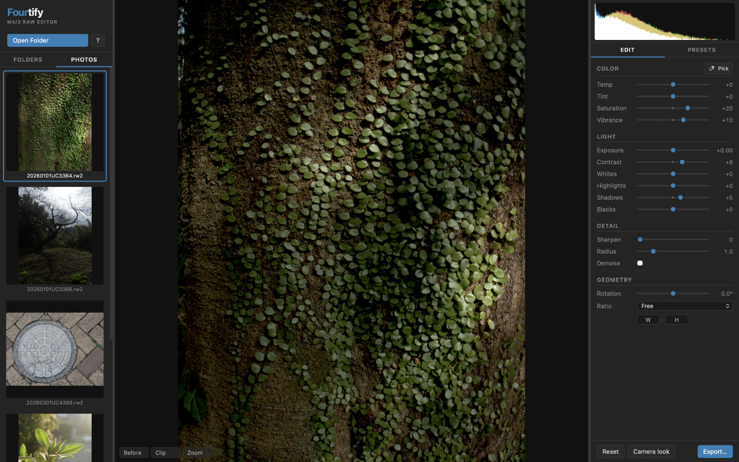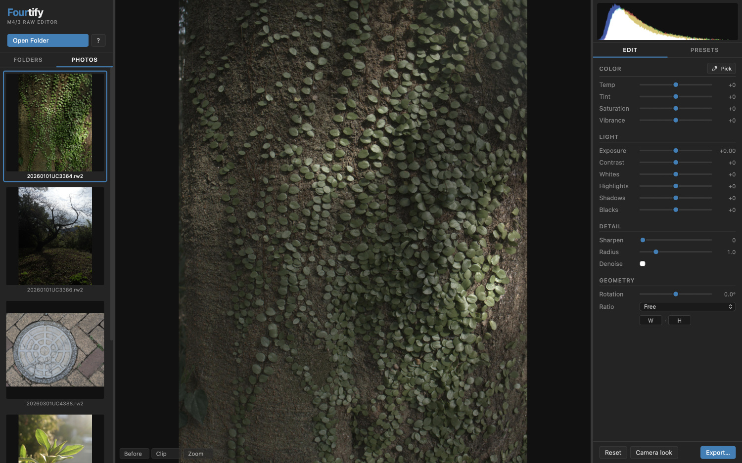 I have made some software to curate and tweak RAW photos taken with micro four thirds equipment from Panasonic, Olympus, and OM System. It is not intended as a full-featured editor — just a fast, focused tool for the M4/3 shooter's workflow: quick tonal and colour adjustments, crop and rotation, light-touch sharpen and denoise and that's about it. It is 100% vibe-coded and runs on MacOS or on Linux for Intel (installs from a .deb, .rpm, or .AppImage file).