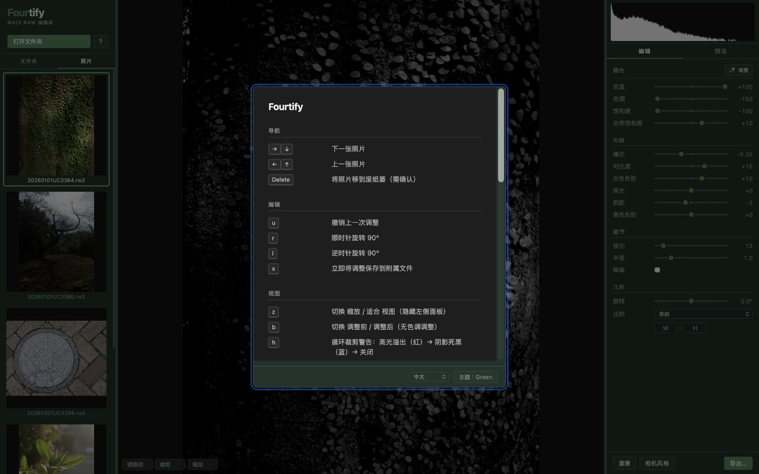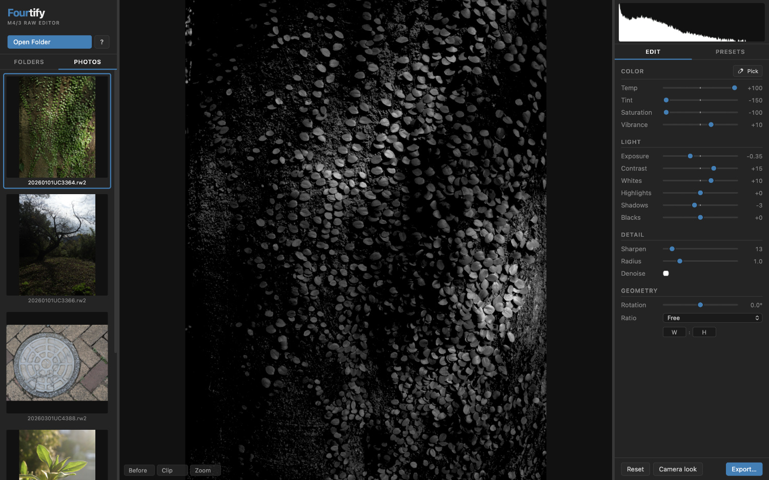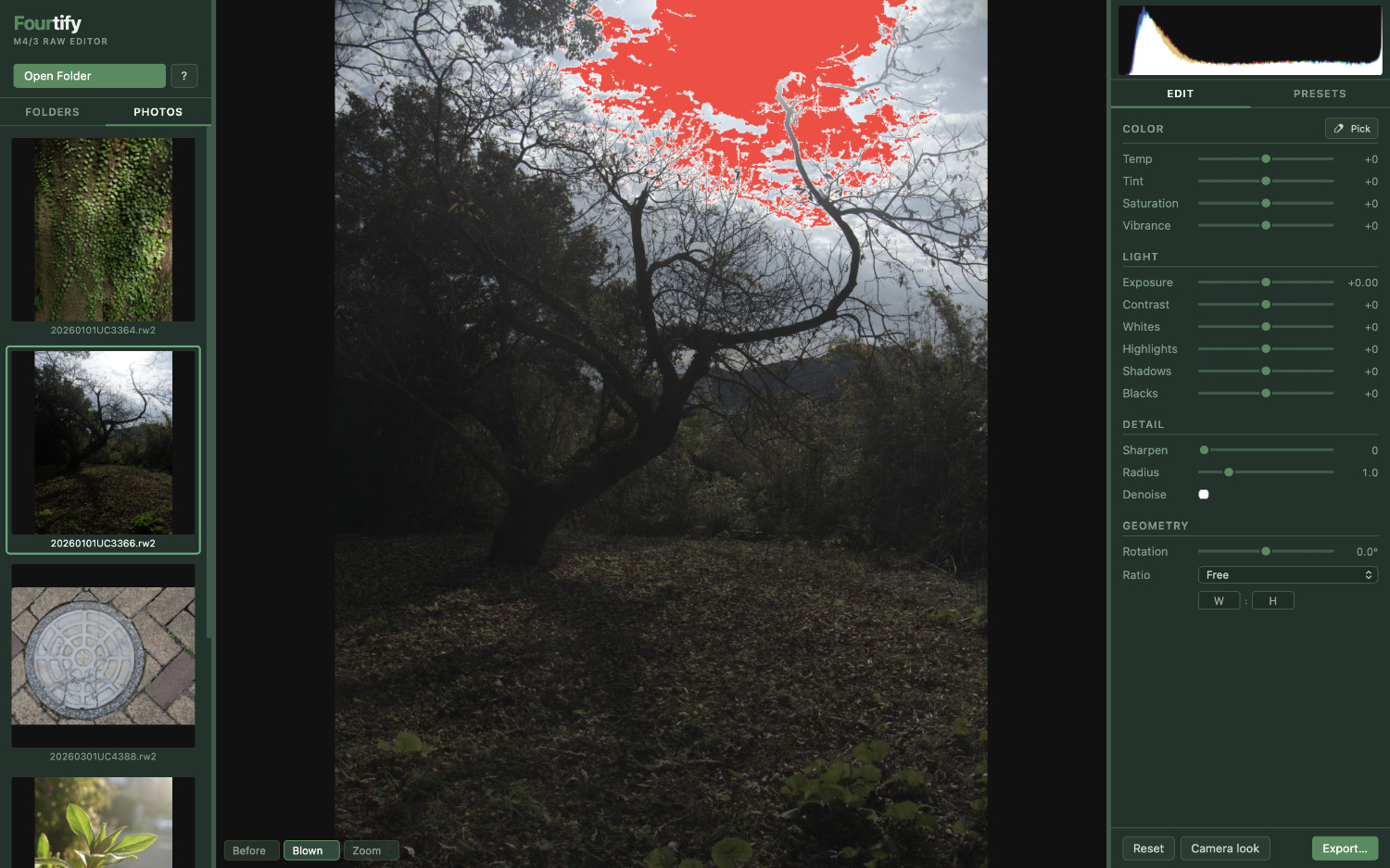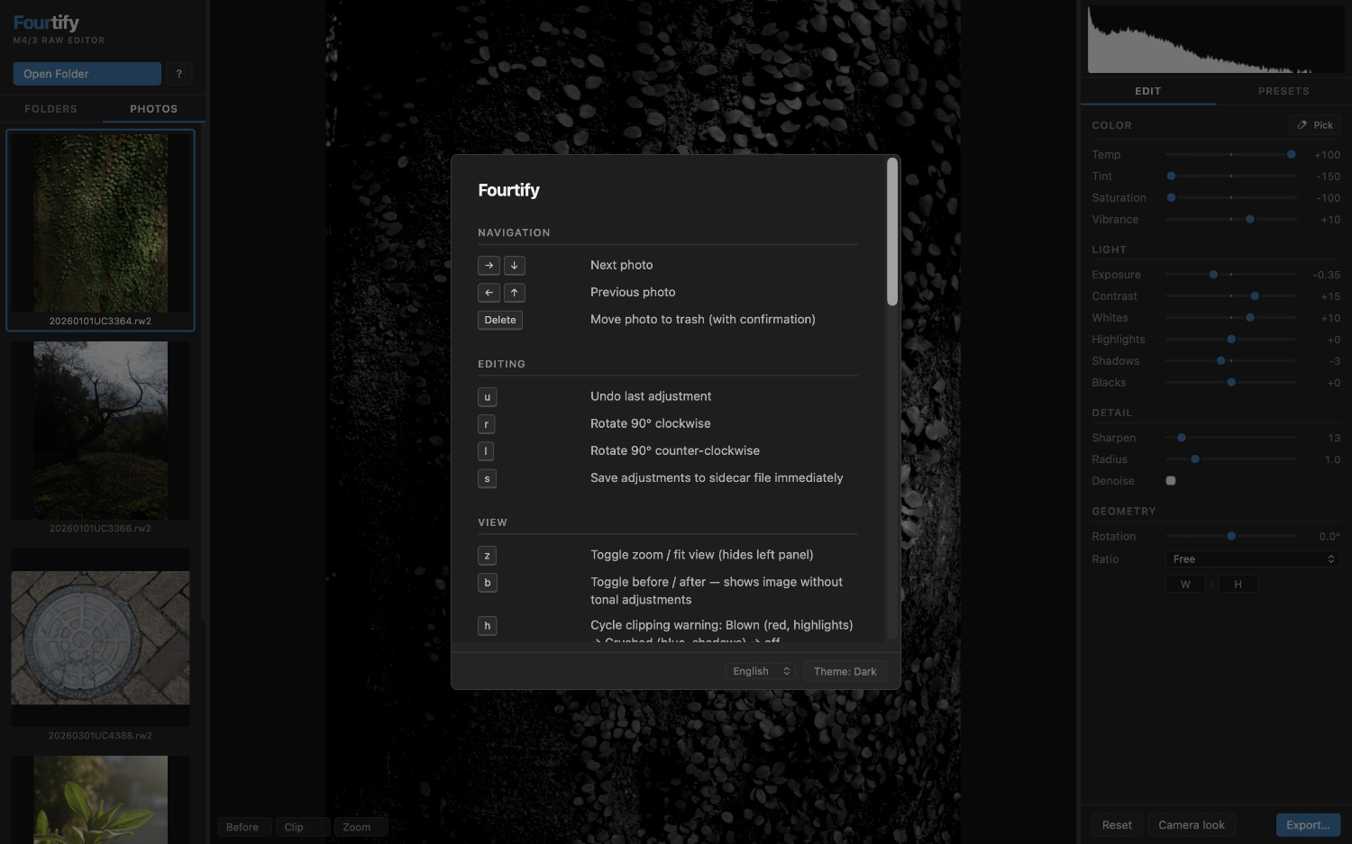 I have made some software to curate and tweak RAW photos taken with micro four thirds equipment from Panasonic, Olympus, and OM System. It is not intended as a full-featured editor — just a fast, focused tool for the M4/3 shooter's workflow: quick tonal and colour adjustments, crop and rotation, light-touch sharpen and denoise and that's about it. It is 100% vibe-coded and runs on MacOS or on Linux for Intel (installs from a .deb, .rpm, or .AppImage file).