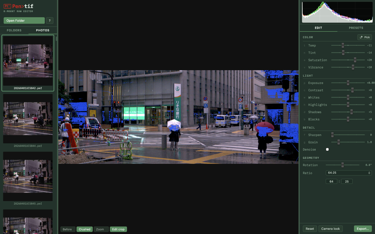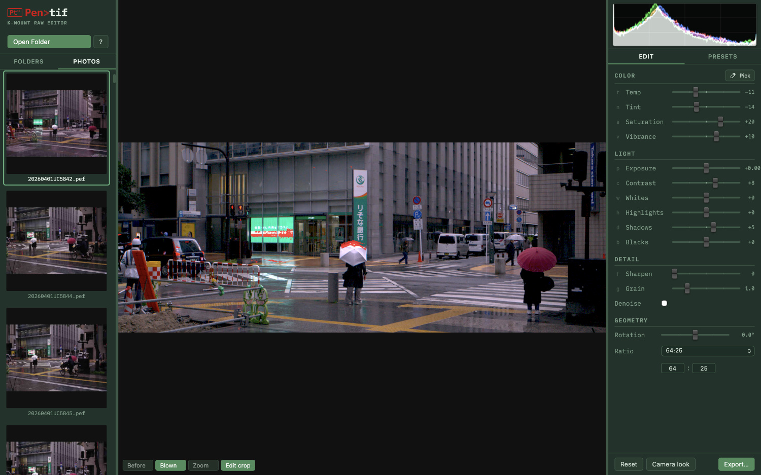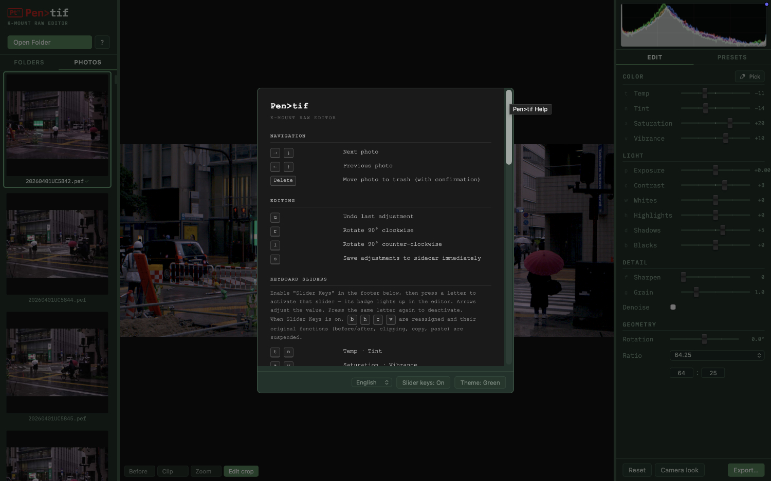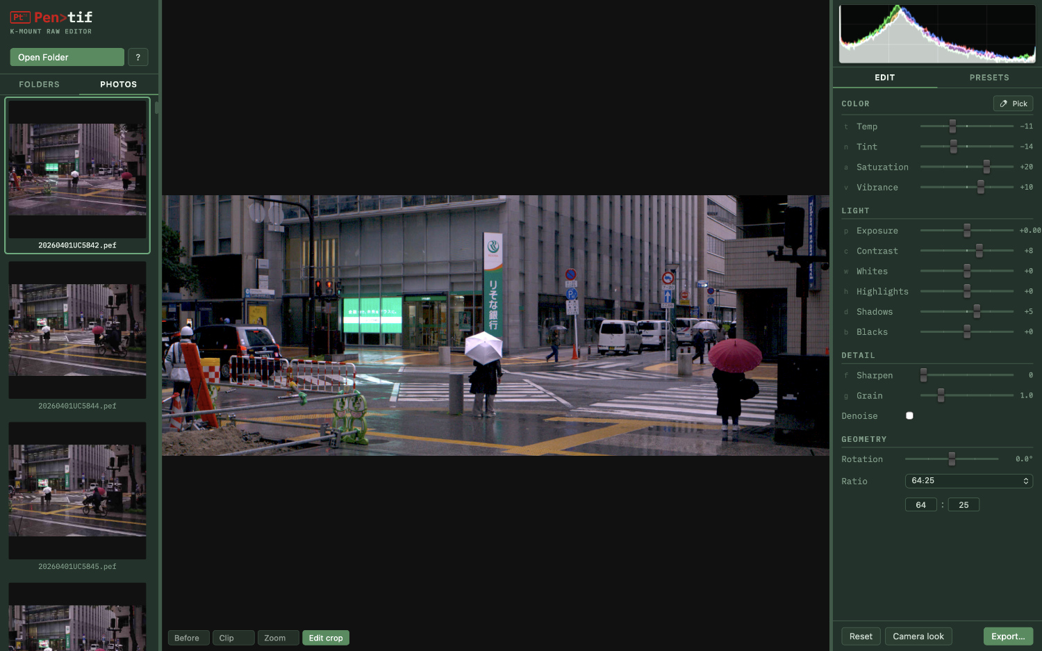 It is not intended as a full-featured editor — just a fast, focused tool for the Pentax shooter's workflow: quick tonal and colour adjustments, crop and rotation, light-touch sharpen and denoise and that's about it. It is 100% vibe-coded and runs on MacOS or on Linux for Intel (installs from a .deb, .rpm, or .AppImage file).