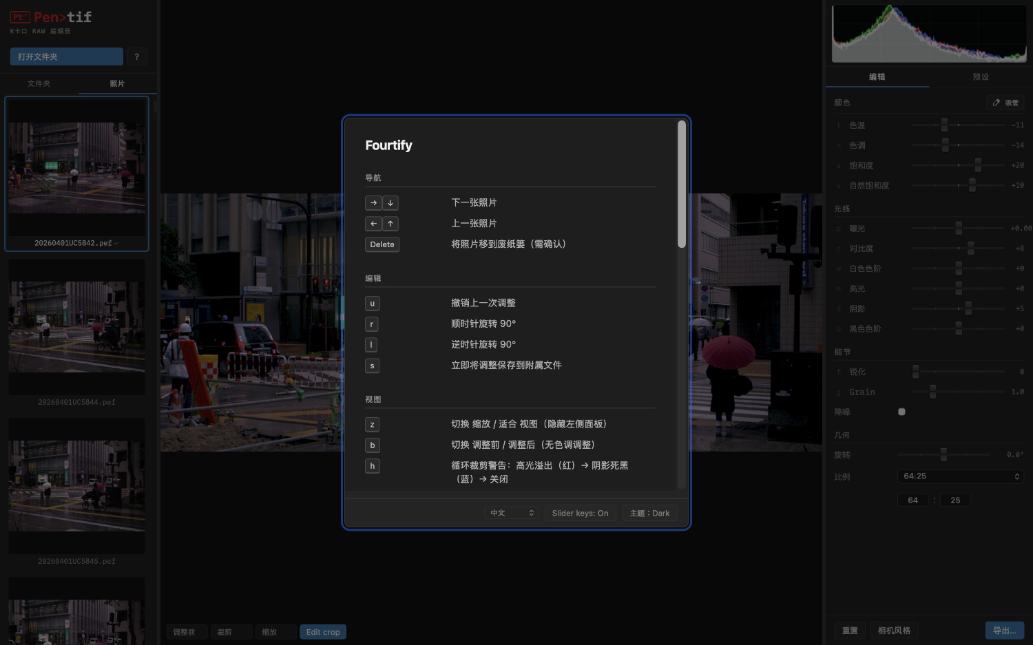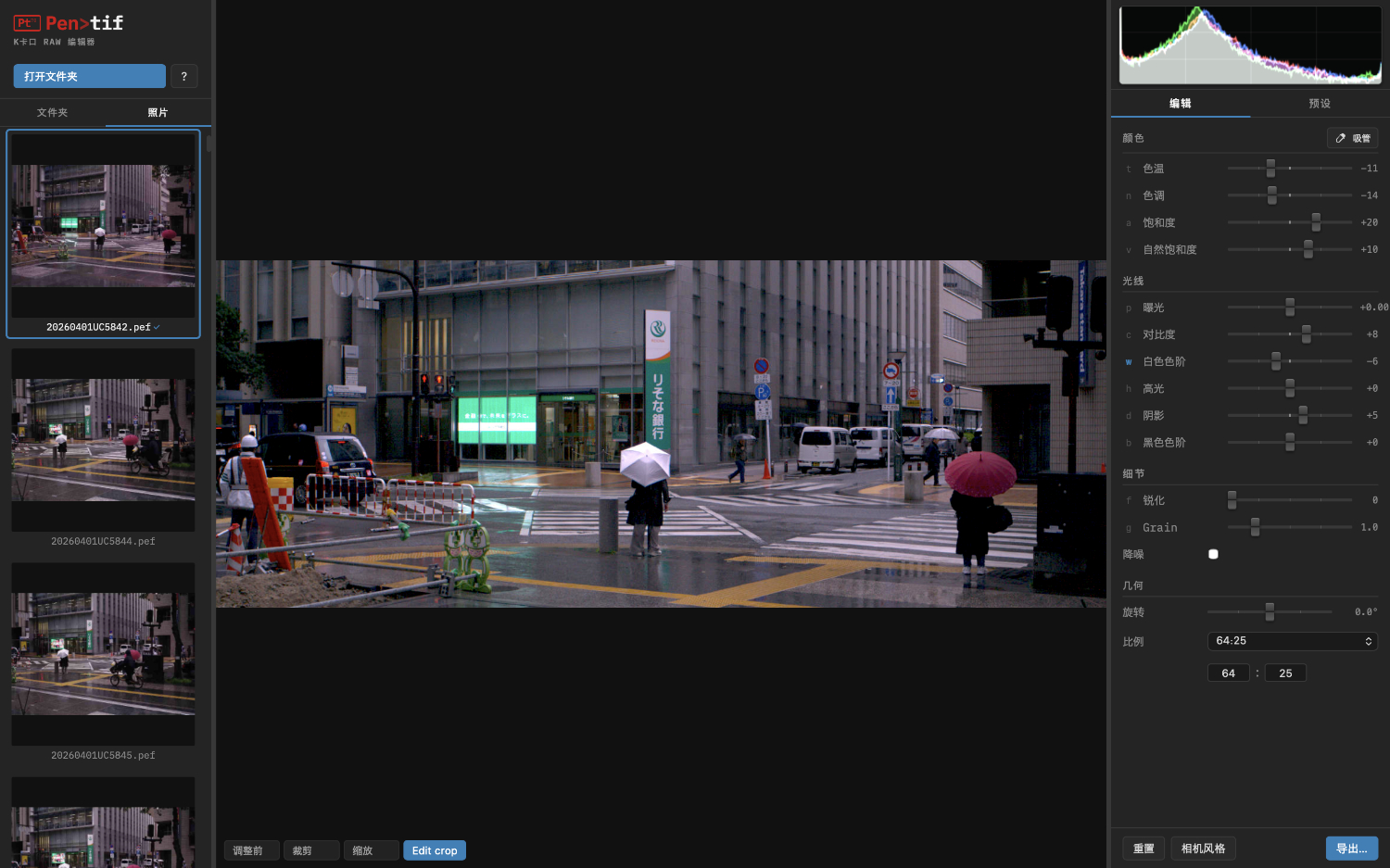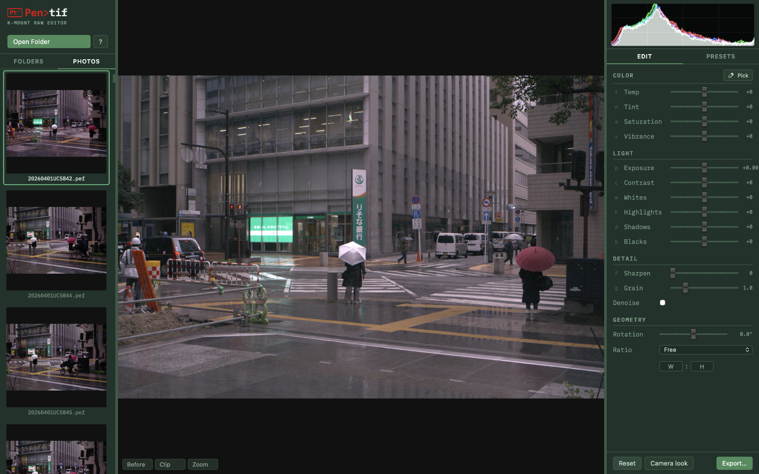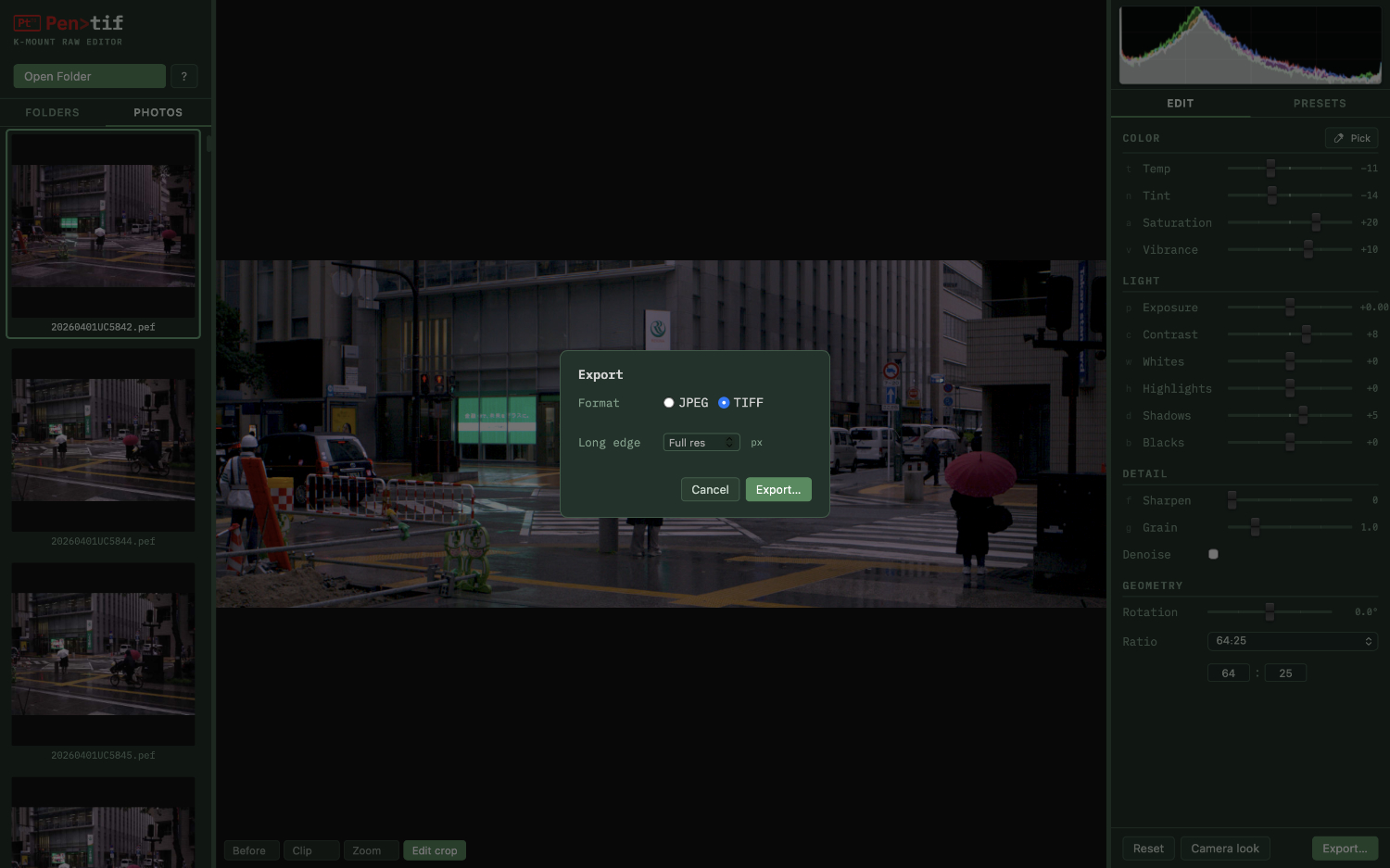 It is not intended as a full-featured editor — just a fast, focused tool for the Pentax shooter's workflow: quick tonal and colour adjustments, crop and rotation, light-touch sharpen and denoise and that's about it. It is 100% vibe-coded and runs on MacOS or on Linux for Intel (installs from a .deb, .rpm, or .AppImage file).